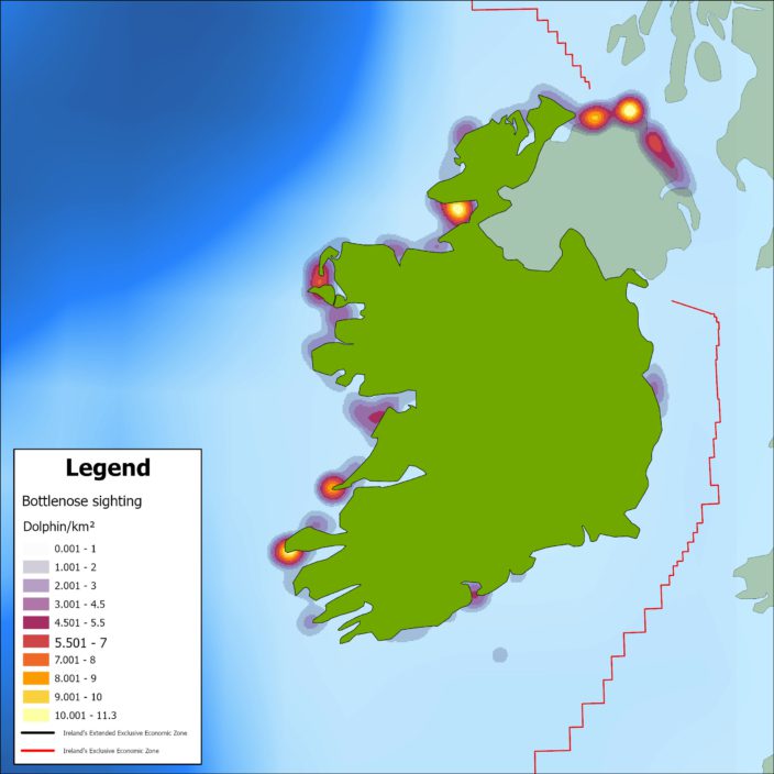 Three separate populations have been identified using genetic studies and photo-identification in the Shannon Estuary, coastal and offshore waters. Some dolphins in the coastal population have been documented moving along the Irish coast and even north to Scotland while the Shannon population is resident to the estuary and surrounding areas and little is known about the offshore population. Since the late 2010’s there has been an increase of sightings in the north, northeast of Ireland.