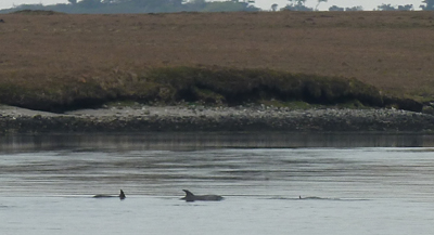 Carol reports ….” They are still swimming at times in very shallow water close to the shore and then returning to deeper water and back again. We also observed the occasional leap out of the water. The water was choppy this evening but it was still very easy to spot the dolphins from the shoreline.”