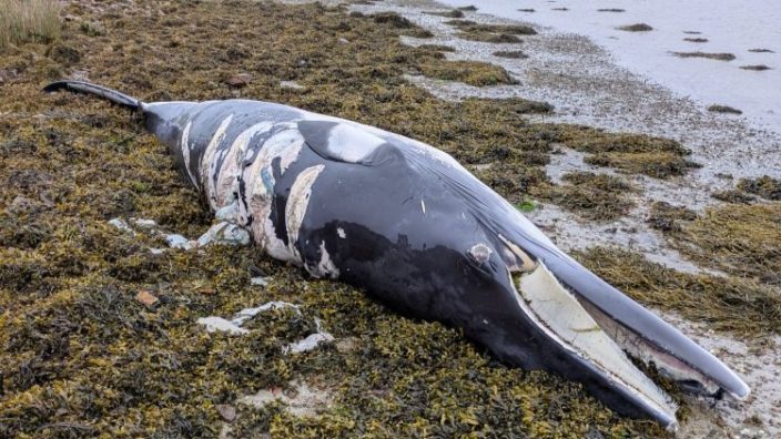 On the evening of the 9 June 2025, the IWDG received a report of a large carcass floating off the coast of Galway. A few hours later the animal had stranded on Rusheen Bay, Co. Galway. The distinctive white “arm band” on its pectoral fin quickly identified it as a minke whale. The cause of