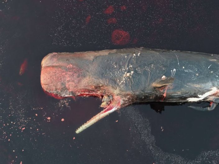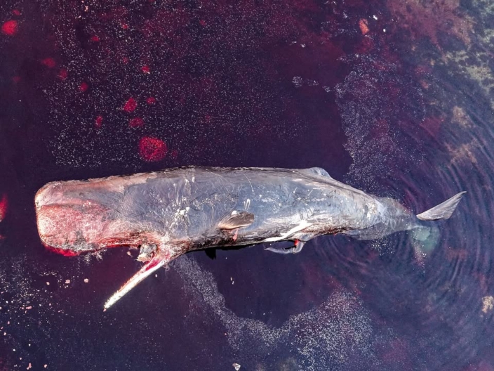 Final Report IV: A team from SMASS (Scottish Marine Animal Stranding Scheme) were on stand by to carry out an investigation of the sperm whale on Wed. 9th, alas it was taken back by the sea on a falling tide and the carcass was lost for a few days, until it came back ashore on