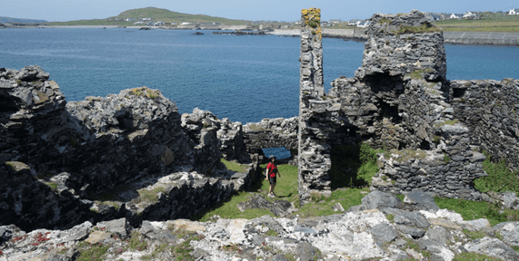 Fiona exploring the ruins of Cromwell Barracks while listening to the calls of the rare Corncrake bird.