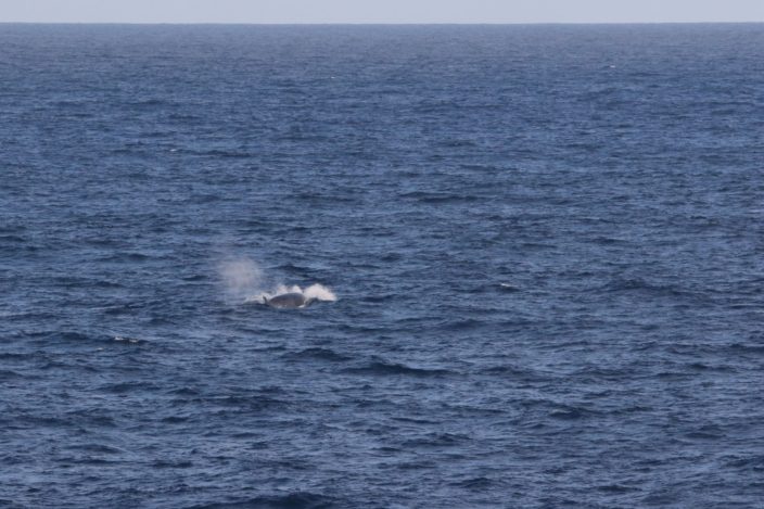 Most large whales kept their distance, their identity betrayed solely by distinct blows. Repeated angled blows on the port side? Sperm whales, probably preparing for another deep dive as we sailed over 1000+m depths. Tall columnar blows seen from large distances gave away a fin whale. Images showed a potential sei whale as the blow and the dorsal fin were seen in the same shot. The coup de grâce came as we were estimating the distance of a potential fin whale with our range finders. Our attention was suddenly grasped by a blow not 50m away from the side of the ship as a fin whale came to the surface. Most of the blows and large whales were caught on the thermal camera.