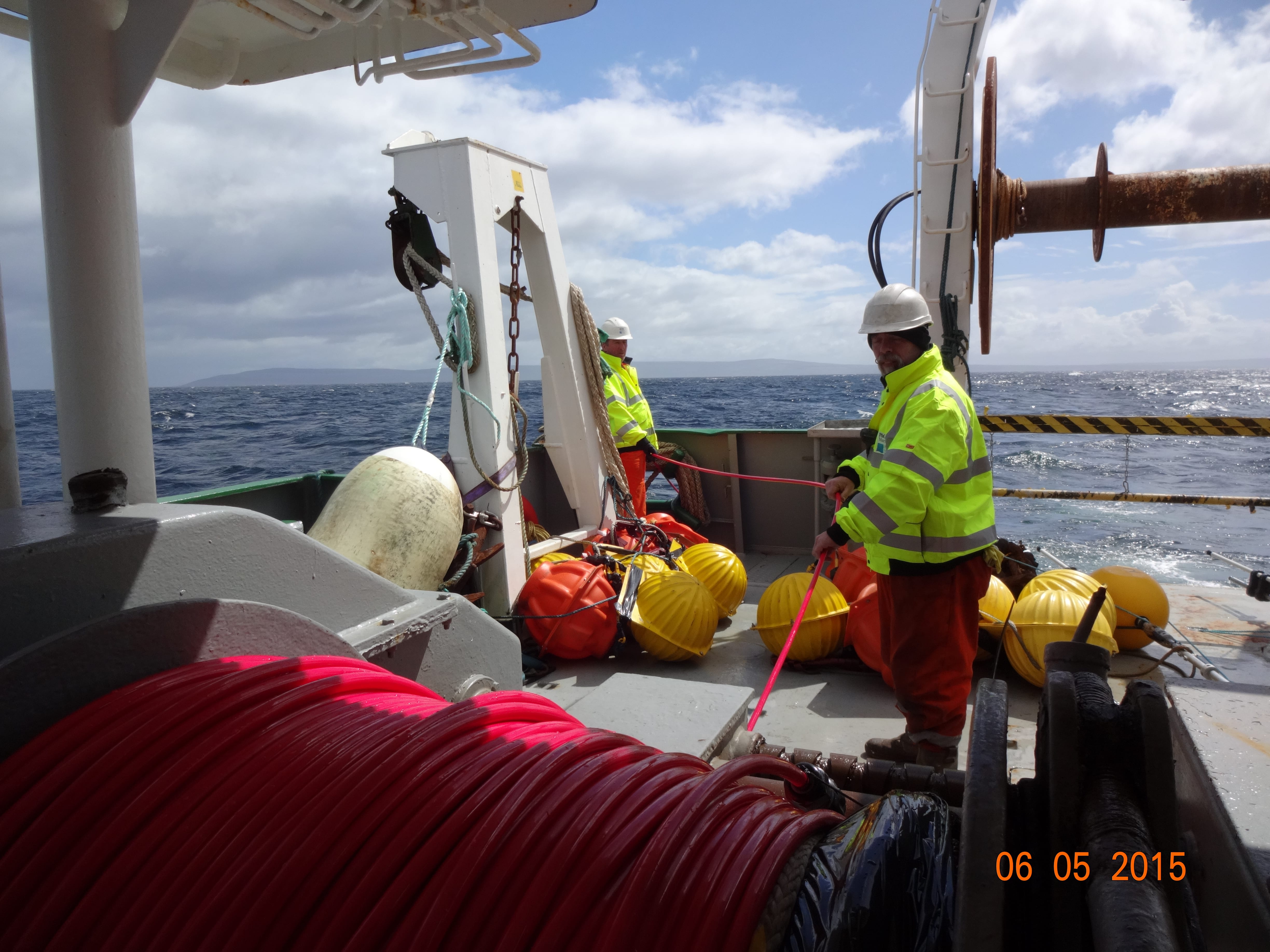 The deep diving nature of sperm whales means that they are difficult to observe at sea at the best of times. During a single dive, sperm whales can spend nearly an hour at depths in excess of 300m, with only short periods at the surface. The limited time spent at the sea surface combined with the wild weather that prevailed throughout the survey – more than 70% of the time the team spent looking for marine mammals was during 3m swell and strong winds – resulted in only 11 individual being sighted during 388 hours of effort.  The ability of hydrophones to record sperm whale vocalizations, however, is not impacted by weather and surveys can continue through the night 24/7. In all, 391 acoustic sperm whale detections were recorded.