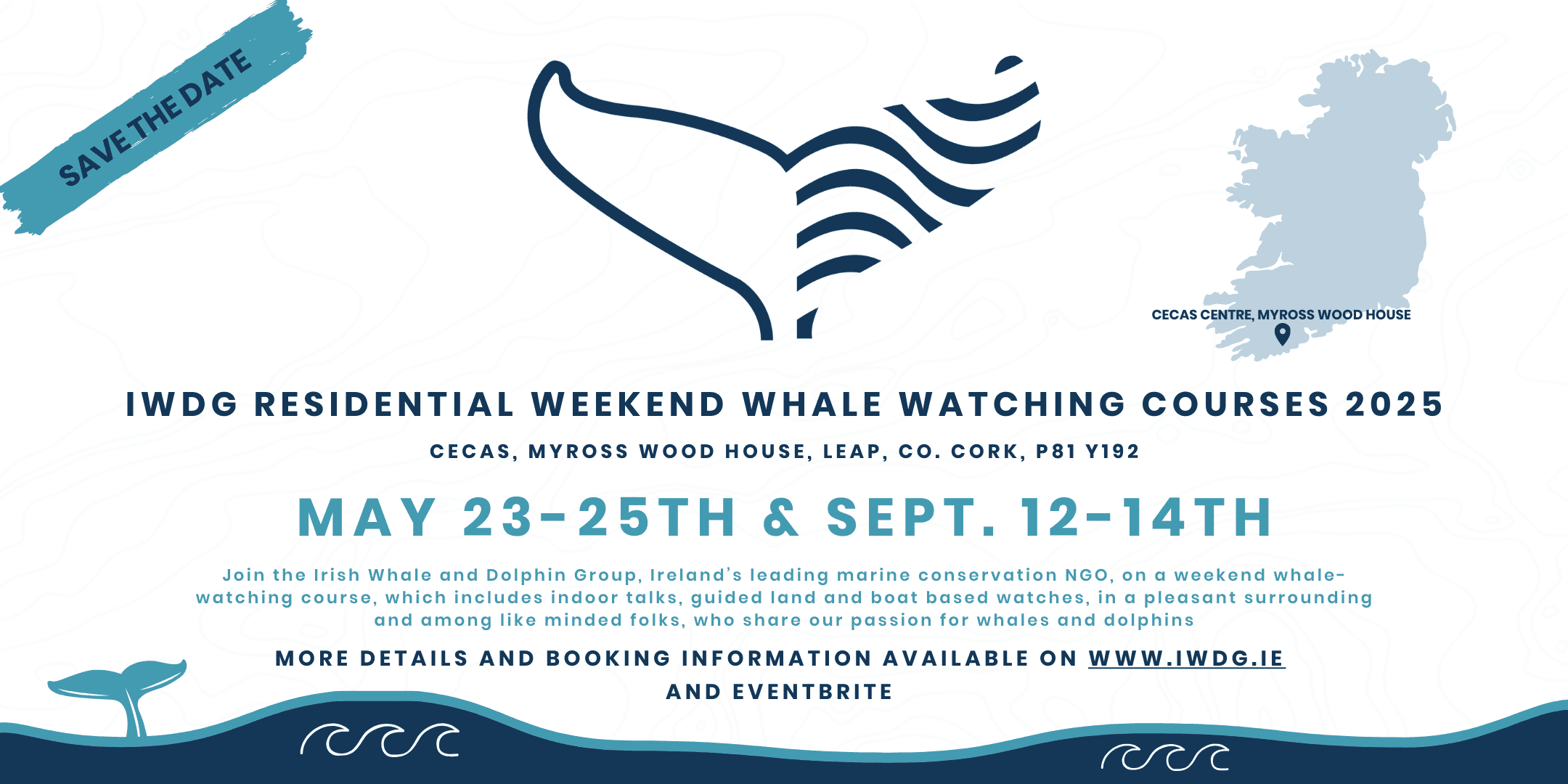 As always IWDG extend a huge mile buiochas to all of you who have helped our research and conservation work by reporting your humpback sightings to the IWDG in 2024. Your support makes it more likely that they will return to Irish waters in the years ahead. If you’d like to learn more about our humpbacks and other whale species in Irish waters, one of our two Residential Weekend Whale Watching courses at the CECAS Ctr., in Leap, west Cork this summer could be of interest. (graphic below)