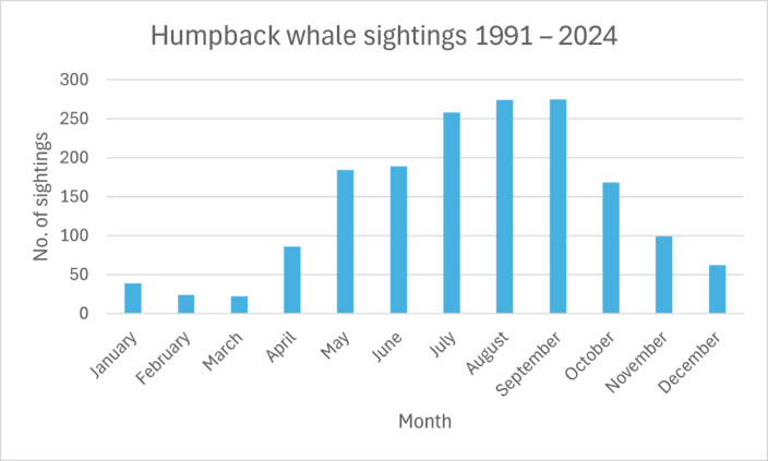 At least 136 individual humpback whales have been recorded to date (2024) in Irish waters using photo-identification since 1999. Many of these return to the same areas of the southwest year after year, and some have even been recorded over three decades. Others have been recorded internationally off Gibraltar, the Netherlands, Norway and Iceland. Since 2015 sightings of humpback whales in Ireland has increased, with a northbound distribution shift towards donegal bay noted.