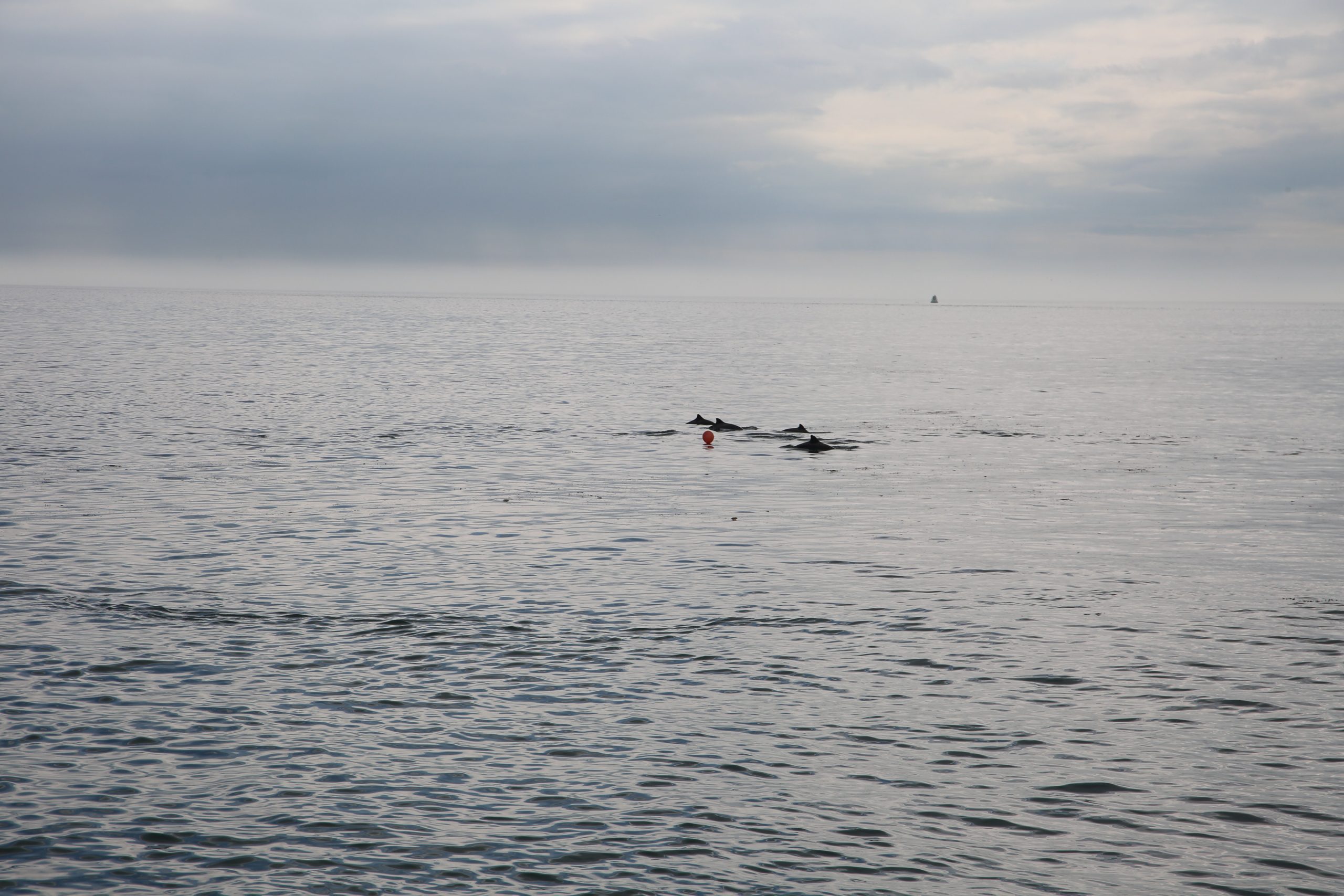 Pod of common dolphins swimming or possibly feeding by a red balloon by the Arklow Bank. Photo by Una Healy.