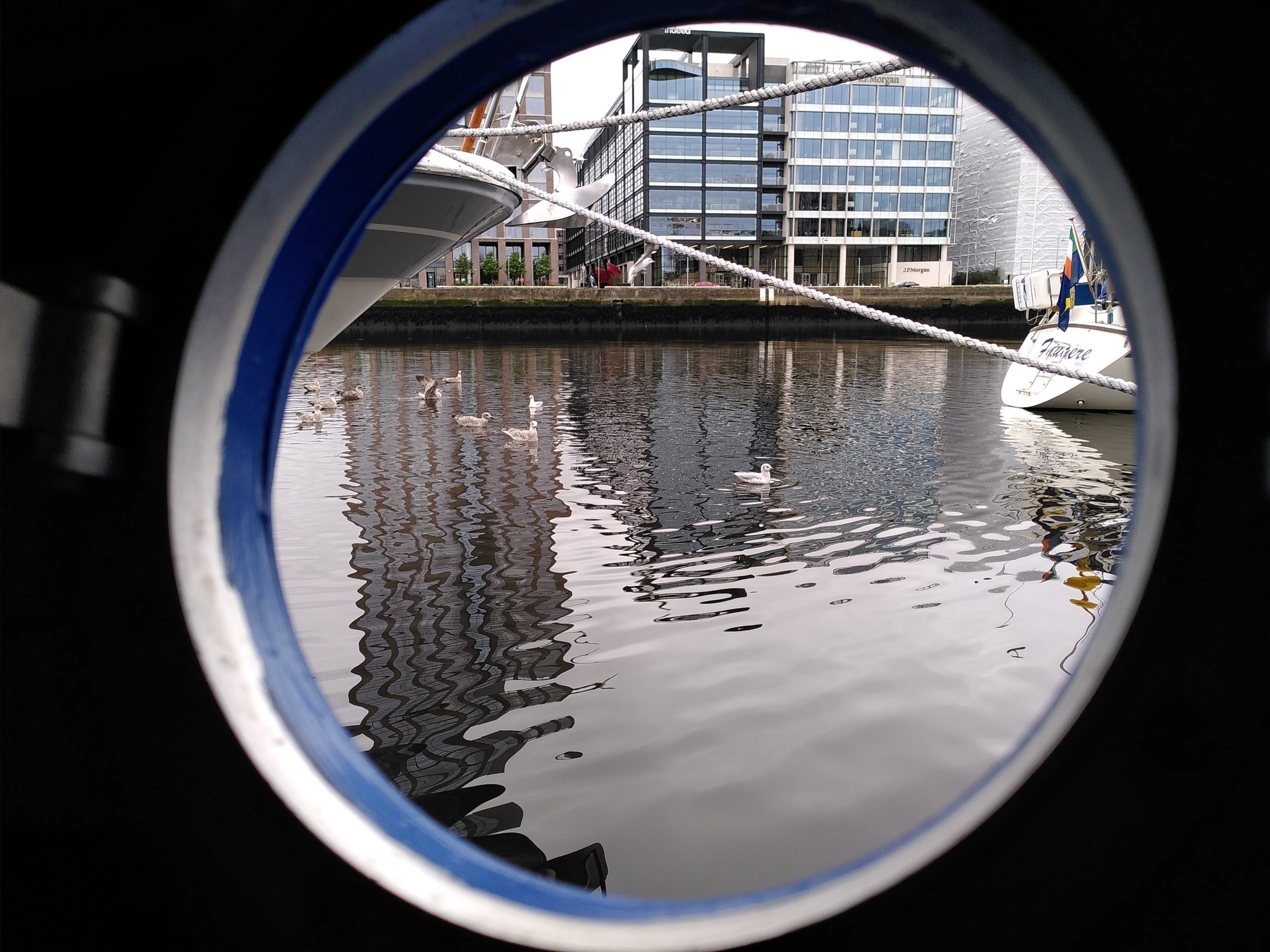 Thursday dawned overcast and foggy, although conditions on the water were calm and still. Celtic Mist made an early start for Arklow in the fog. Visibility was poor, less than one kilometre. The fog lifted a little around Bray, Co. Wicklow, as we encountered a grey seal eating a dogfish under the watchful eyes of two gulls. We spotted only one cetacean, a harbour porpoise whose fin appeared twice behind Celtic Mist. Despite slowing the boat to a crawl, the porpoise did not reappear. We passed plenty of lion’s mane jellyfish at regular intervals, and debated whether they were appetising to cetaceans and might act as a food source drawing them towards us. They did not! We reached Arklow around 4pm and despite having a few hours of daylight left, moored for the night as the fog was thickening. We were treated to cakes and sourdough bread in Arklow and began preparations for Saturday’s Three Bridges Liffey cruise, cleaning Celtic Mist, and finding and hanging flags and the IWDG banner.