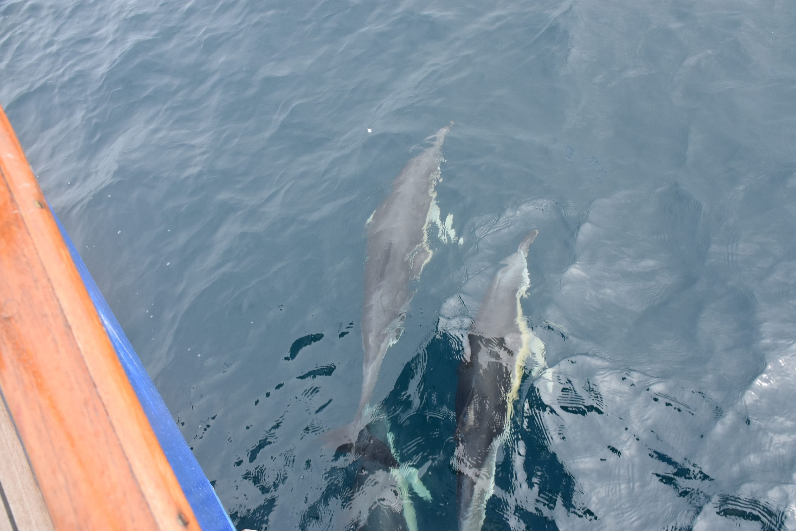 Common dolphins bowriding the boat, leaping and twirling. Image by Li-Ann Small/IWDG