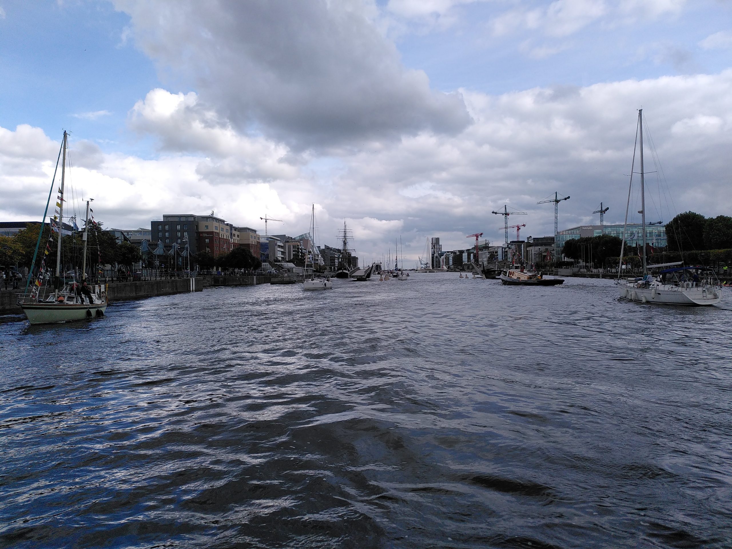 There was further activity on Saturday morning at Poolbeg Marina as more cruisers arrived. The flotilla was 38 strong and joined by a Thames tugboat, a rowboat with bagpipes, speeding jetskis, and tourist kayakers. The Tom Clarke Bridge (toll bridge), Samuel Beckett Bridge, and Seán O’Casey Bridge were all opened to facilitate the Three Bridges Liffey cruise. The boats cruised up the Liffey as far as the Matt Talbot Bridge before returning to moorings by the 3 Arena to spend the night. It was too windy unfortunately for Celtic Mist to raise any sails, although one or two others did, including a spinnaker.