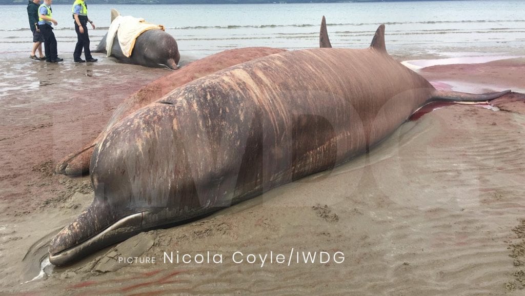 The IWDG received a call on the morning of the 19th August to report a live stranding. Initially the animals were reported as bottlenose dolphins, but after we received a video from the beach at Rossnowlagh, Co Donegal from Thomas and Louise Coleman it was clear these were Northern bottlenose whales.