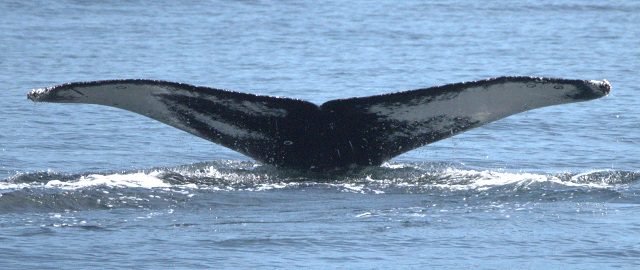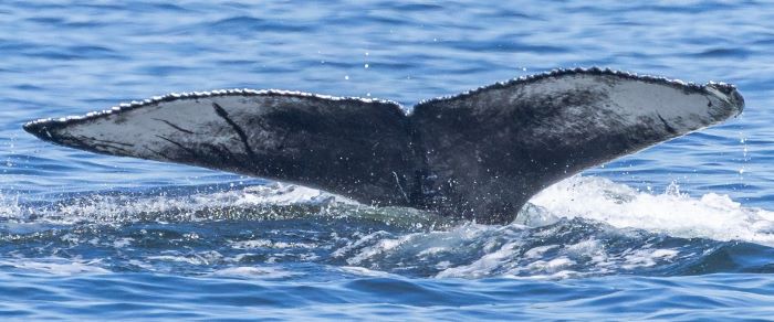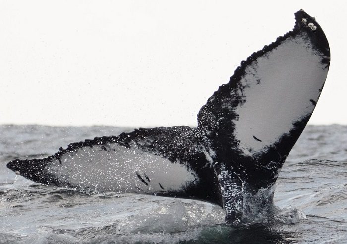 When a humpback whale raises its tail (flukes) it provides an opportunity to photograph its underside (ventral surface). The pattern on the underside is unique to that individual whale and by capturing a good image we should be able to identify the individual whale. These images can be used to track the local short range movements of these whales, and by sharing our images with overseas colleagues, in time, such images could reveal their international movements along migration routes and ultimately their breeding ground.