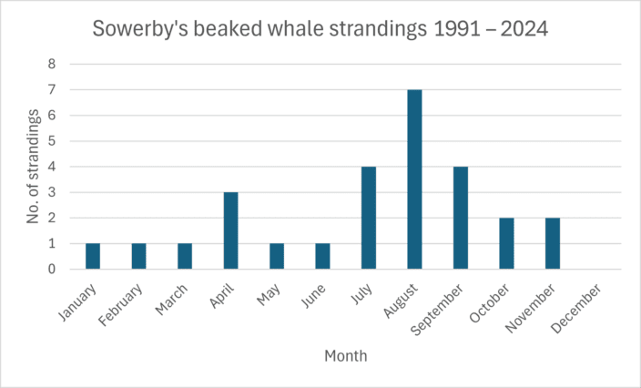 While Sowerby’s beaked whales have been sighted in Ireland once and acoustically recorded repeatidly, most information comes from the multiple strandings. Reports have become more regular since the late 2010s with strandings varying from none to 4 annually.
