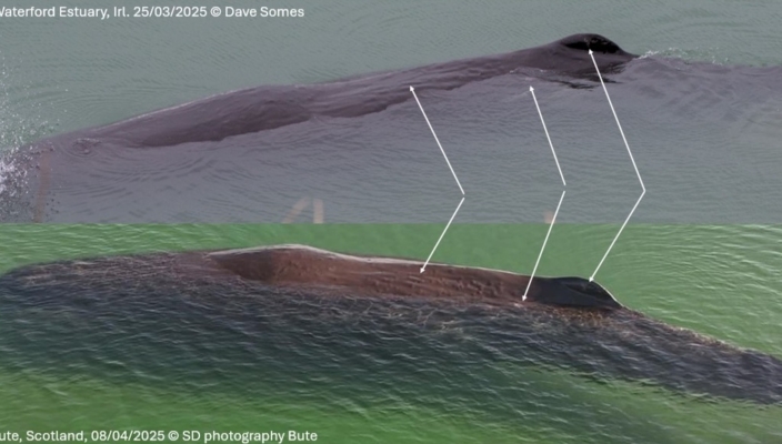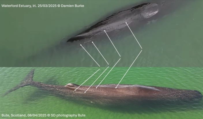 IWDG can now confirm from images received by colleagues at BDMLR yesterday that the Sperm whale that entered Ettrick Bay, on the Isle of Bute, Scotland on Tues. 8th April is a match to the Waterford Estuary whale, which both entered and left the estuary on March 25th. We show below images for comparision which put this matter beyond doubt with identical markings on both sides around the dorsal fin and flanks.