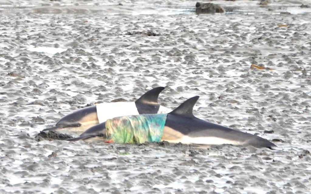 When we arrived at approximately 11.15am, just 15 minutes before low tide, IWDG stranding network volunteer Melissa was already on site. She had been monitoring the situation, identifying the locations of the dolphins and assessing their condition from a safe distance. Thankfully, all dolphins were upright and appeared calm. With sufficient water for refloating not expected until after 2pm, the priority was to keep the animals comfortable while ensuring volunteer safety.